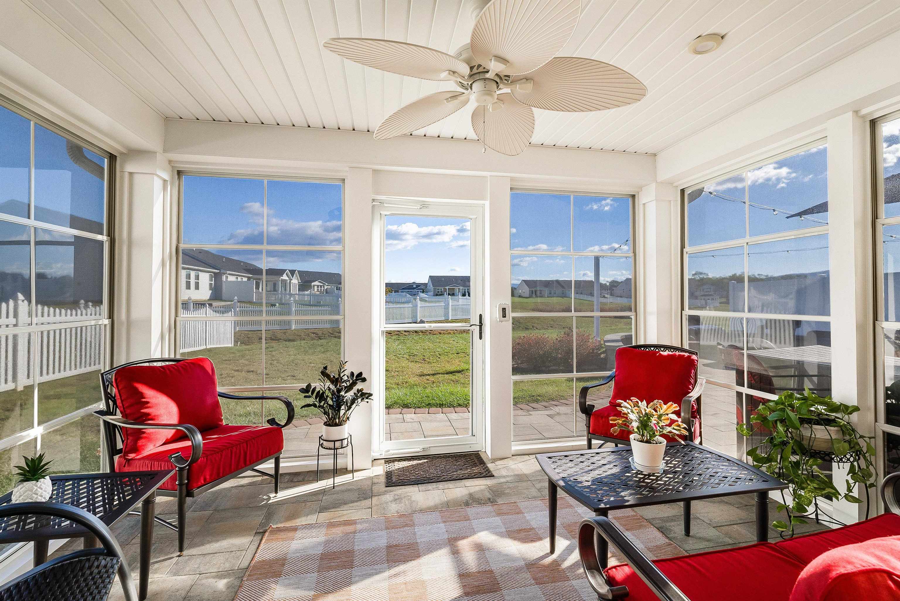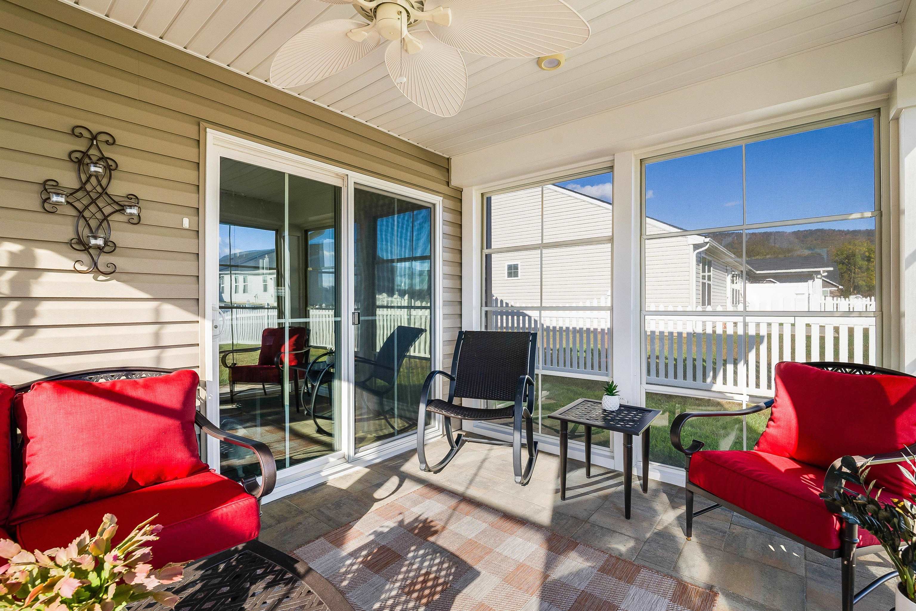 Immaculate 3 bedroom, 2 bath end-unit townhouse offering single-level living and stunning views of Massanutten Mountain. This home shows better than new with numerous upgrades throughout, including an EZ Breeze sunroom, expansive back patio with built-in firepit plumbed to the main propane tank, Generac whole-house generator, electric vehicle charger, and much more. Enjoy easy, low-maintenance living with HOA-covered lawn care, snow removal, and annual mulching. Conveniently located near all the shopping, dining, and entertainment of Harrisonburg and Massanutten; this one is perfect for those seeking comfort, quality, and convenience in a beautiful setting.