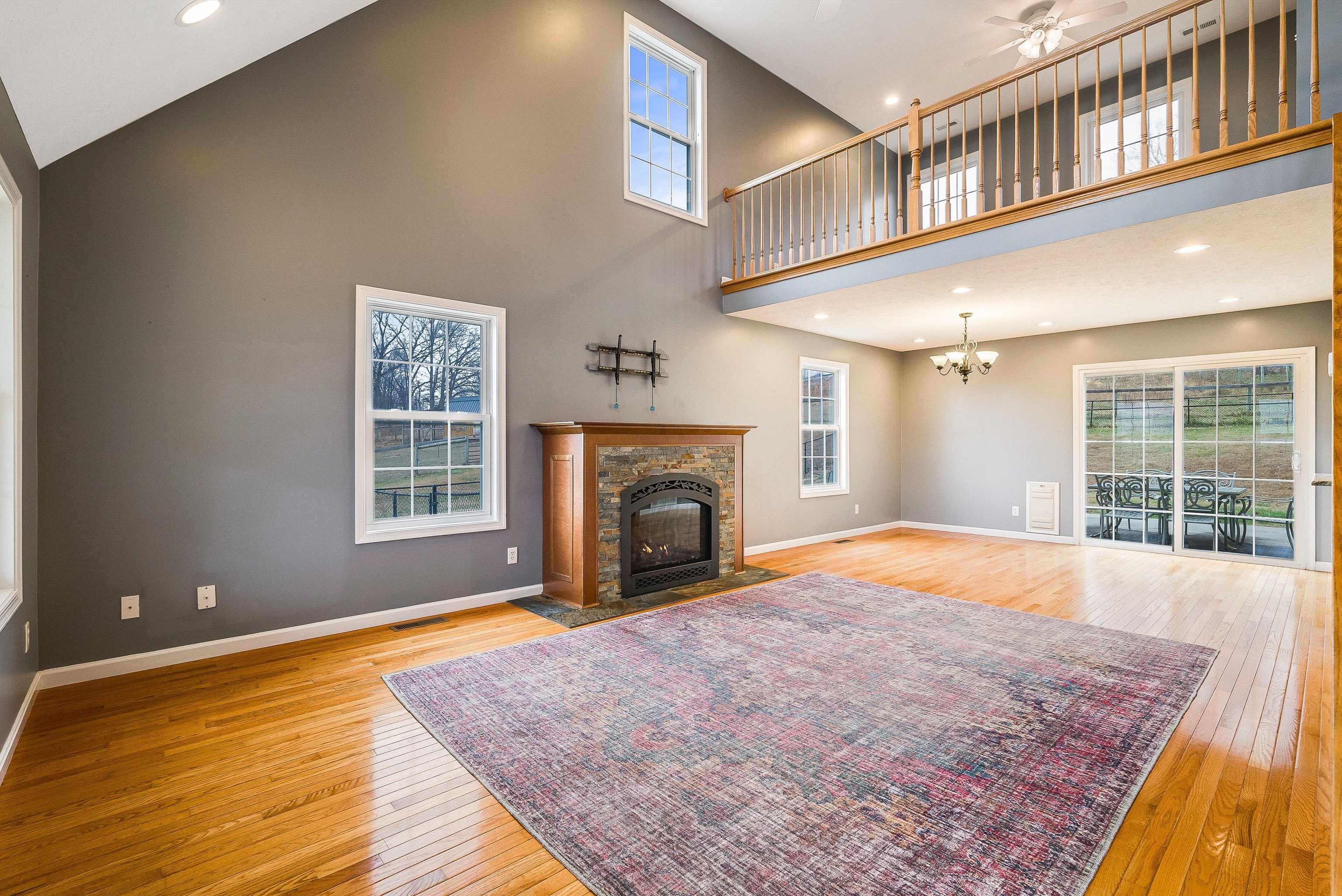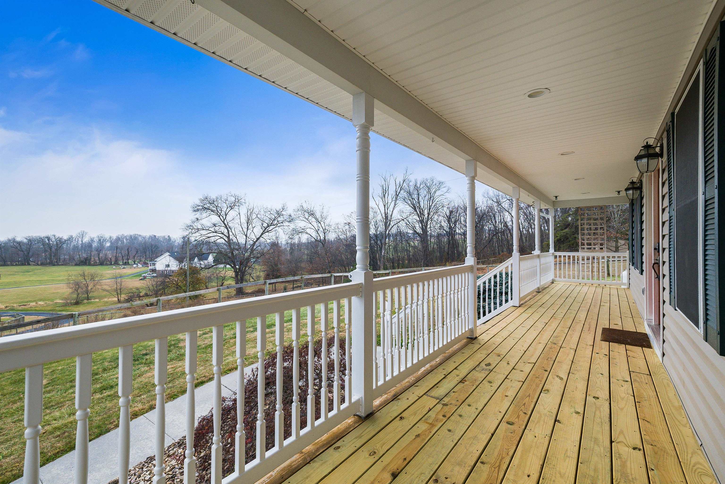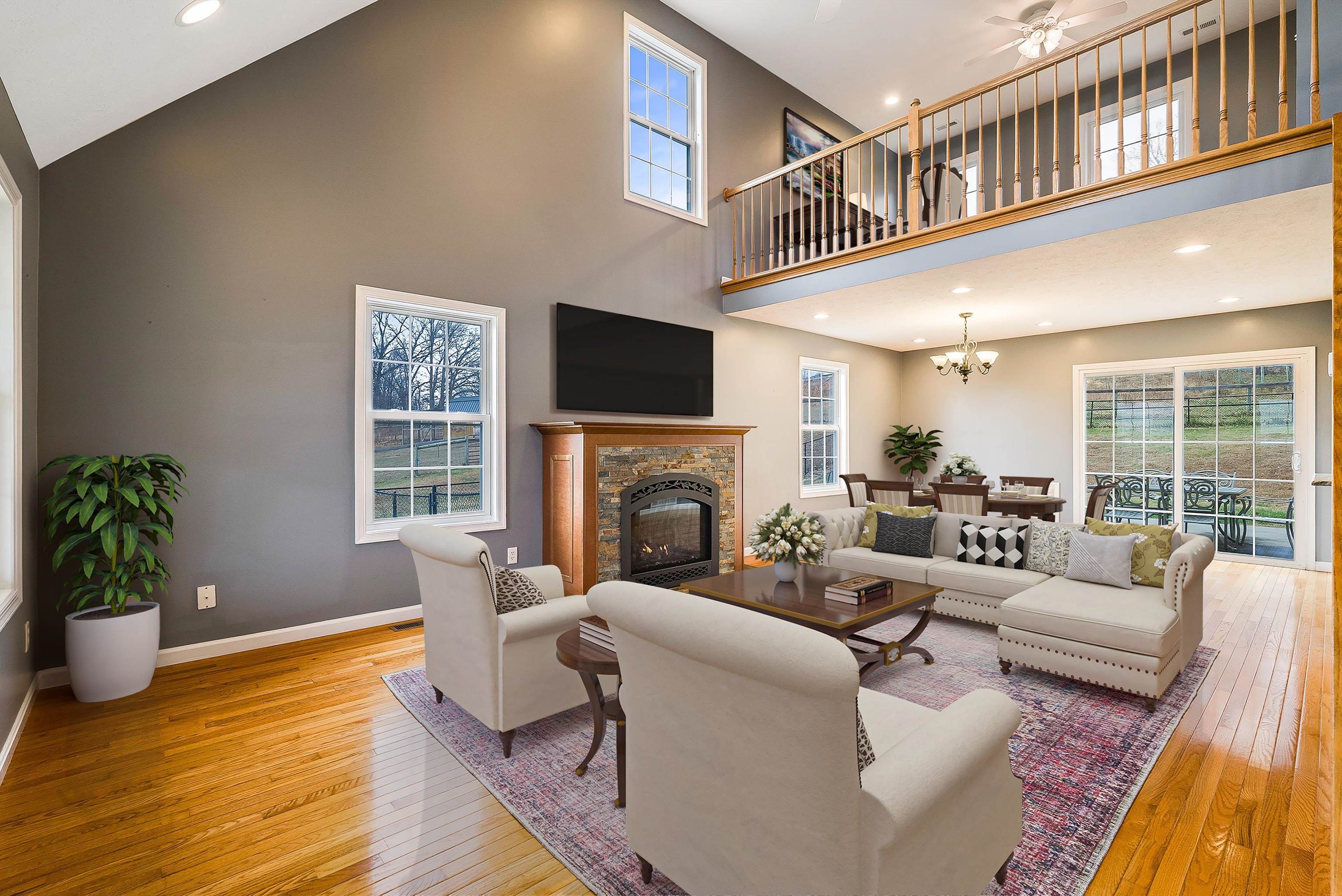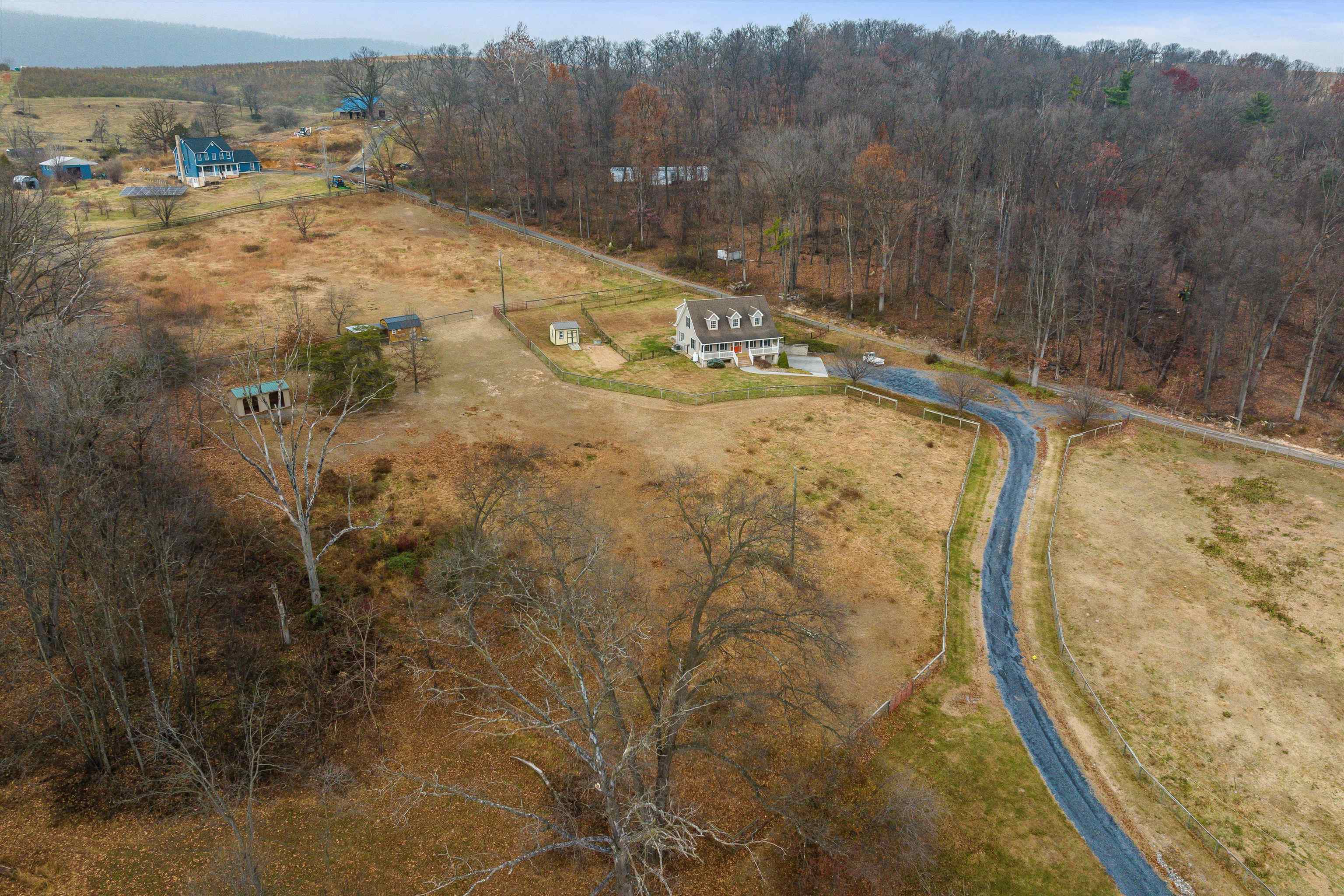 Welcome to this beautifully improved farmette offering comfort, charm, and functionality. This Cape Cod 3-bed, 3.5-bath home features a covered front porch with mountain views, a living room with hardwood floors, gas fireplace, and vaulted ceilings, plus a dining area that opens to the back patio. The kitchen, renovated in 2019, includes stainless steel appliances, double wall oven, induction cooktop, soft-close cabinetry, and leathered granite countertops, with a laundry closet and half bath nearby. The main-level suite adds a double vanity, jetted tub, and shower/tub combo. Upstairs offers an open loft with hardwood floors, two bedrooms, and a full bath. The lower level provides a spacious rec room and full bath. A two-car garage adds convenience. Equestrian features include a large 2015 barn with 4 stalls, wash stall, tack room with electric baseboard heat, and hay loft; 4 fenced paddocks (2015), 2 run-ins, a garden shed, and extra outbuilding. New porch decking completed 2025. A turnkey farmette, equestrian setup, or serene country retreat.