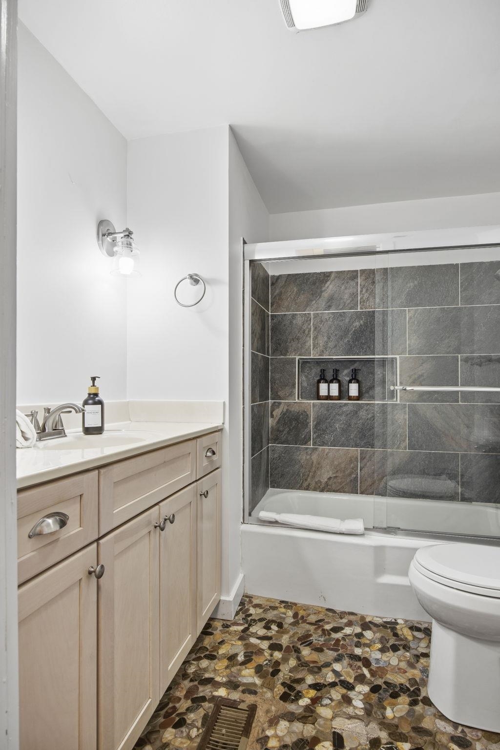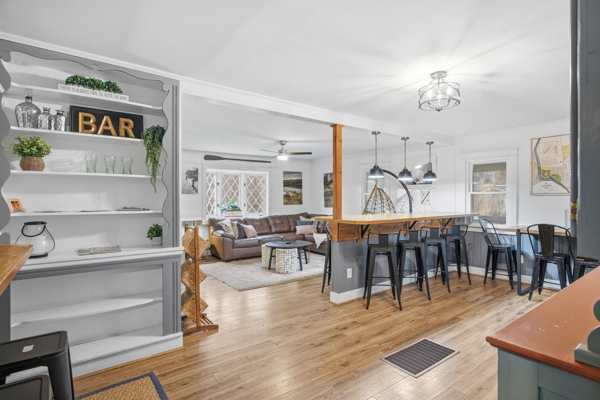 Turn-key 5BR/3BA Shenandoah Riverfront vacation property located on a stunning wide stretch of the river—perfect for fishing, kayaking, and relaxing. Enjoy beautiful river views from this charming cottage. Main level features living and dining areas, charming built-ins, kitchen with wood countertops, stainless steel appliances, and a full bath with tiled shower. Spacious screened-in porch overlooks the river. Upstairs offers two bedrooms with vaulted ceilings, built-in dresser, and a full bath with clawfoot tub. Lower level includes a second living area with walkout patio, three bedrooms, and full bath. Outdoor amenities include hot tub, gazebo, kids’ playground, and large storage shed for mower and kayaks. Could be a great primary residence, second home, or investment, with excellent STR income history—over $100K gross in each of the past two years.