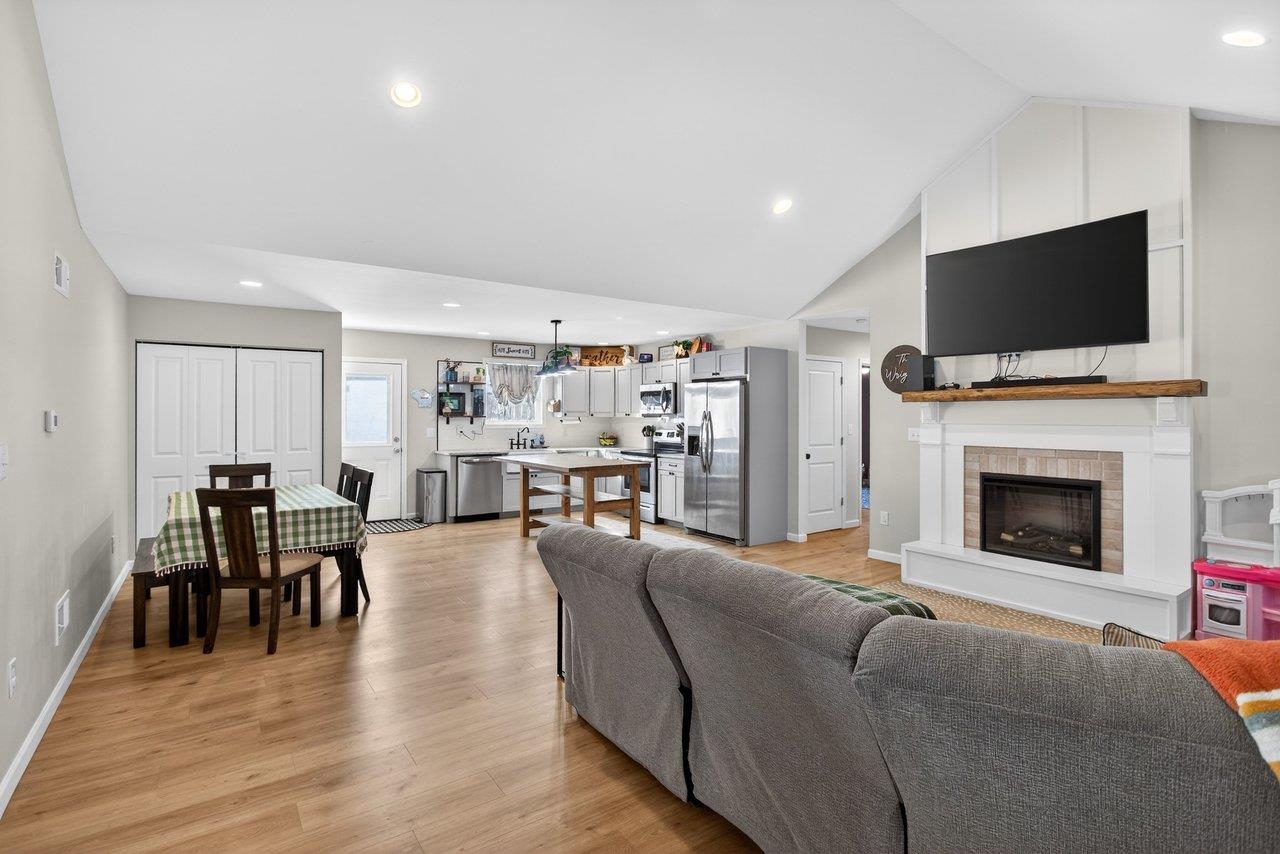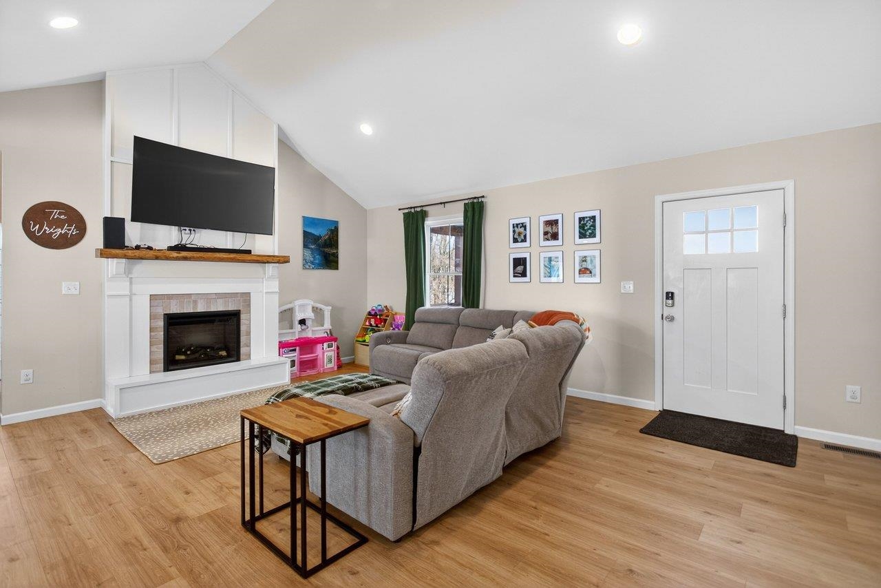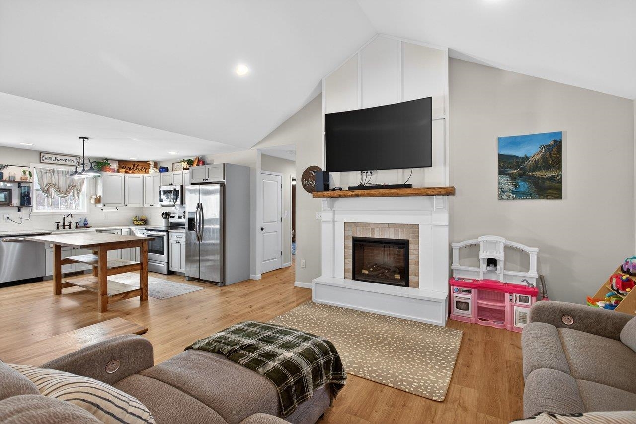 WELCOME HOME! This beautifully maintained home offers desirable one-level living with a one-car garage and a partially finished basement, all set on 1.68 acres with plenty of room to play, relax, or entertain. The fenced backyard is a standout bonus, perfect for pets, gatherings, or outdoor enjoyment. Inside, you’ll find a spacious great room with a vaulted ceiling and a stunning electric fireplace insert, creating a cozy yet open atmosphere. LVP flooring throughout and stainless-steel appliances add modern style and durability. The large primary suite features a walk-in closet, dual vanity, and step-in shower for everyday comfort. Enjoy outdoor living from the inviting front porch or the back deck, ideal for grilling, entertaining, or simply unwinding. The partially finished basement expands your living space with a bathroom, two flex rooms with closets, and an additional sitting or game room. An unfinished area at the basement entrance offers excellent potential for a future mudroom. This home blends comfort, space, and flexibility inside and out.
