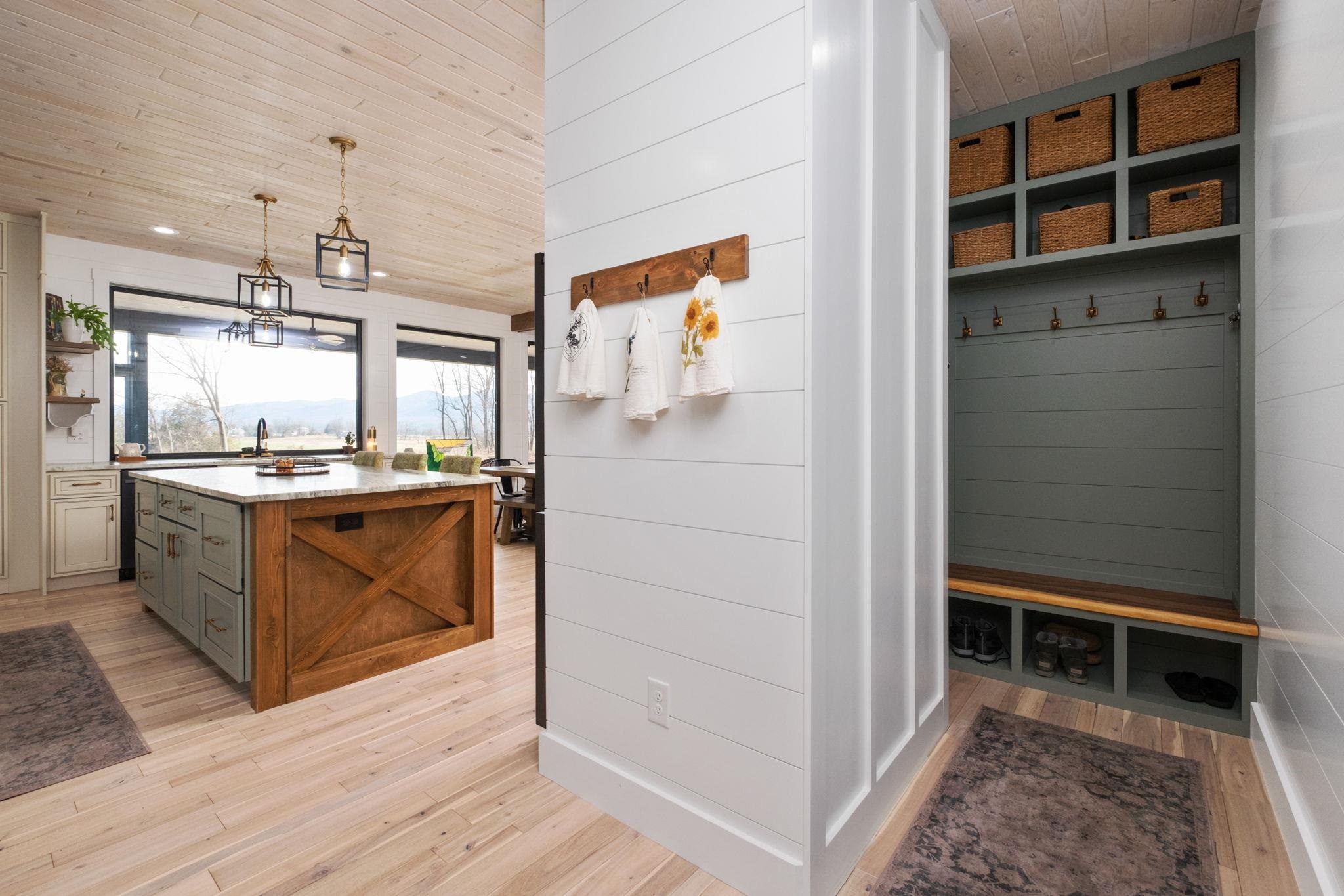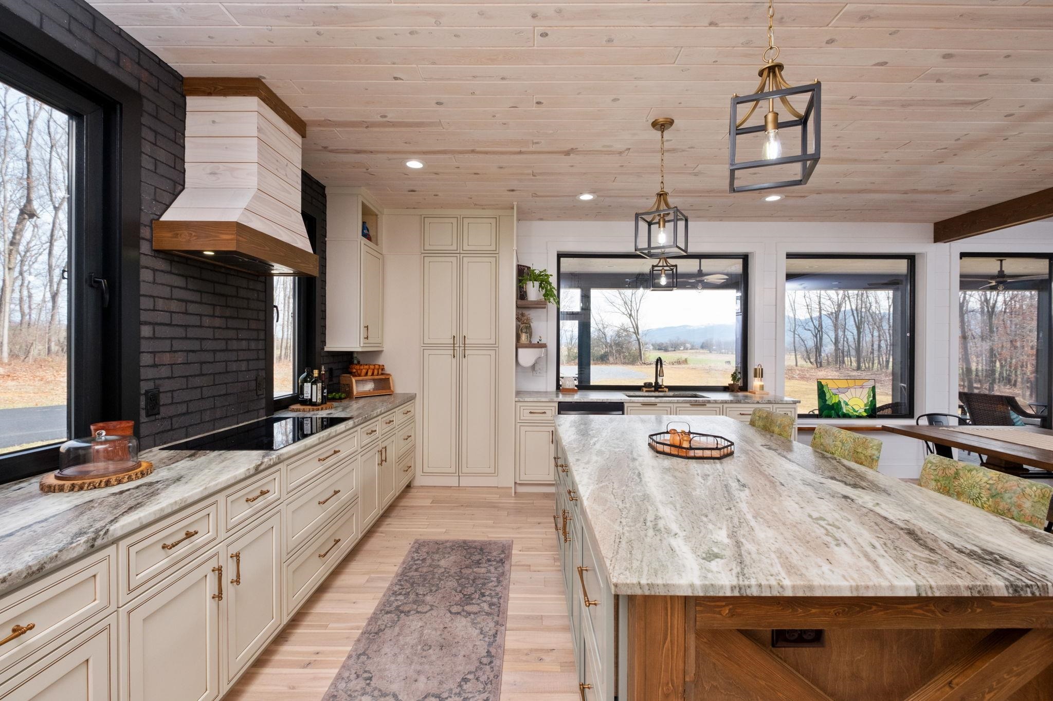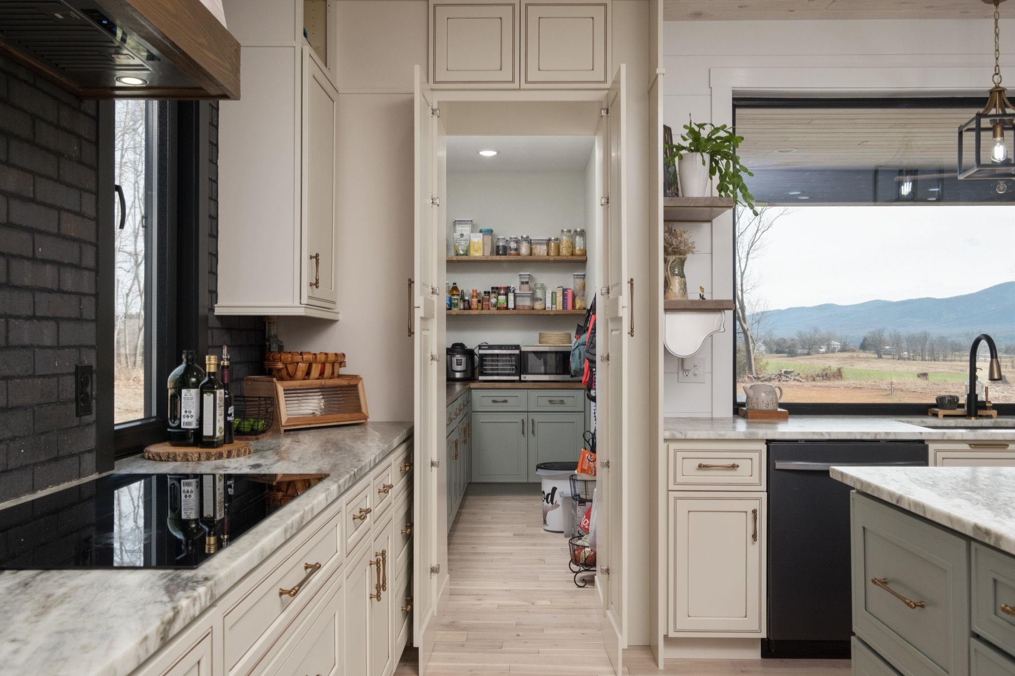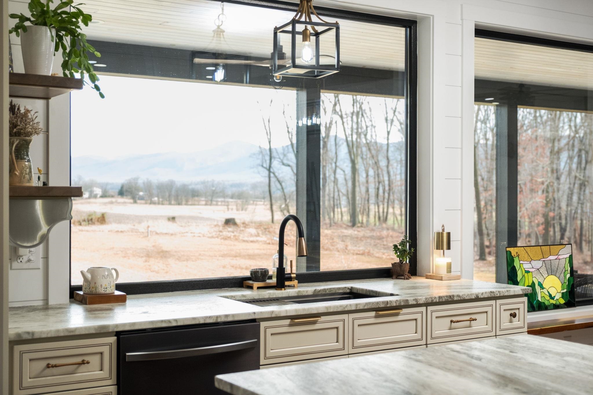 Exceptional craftsmanship and intentional design define this stunning one-level residence set on 5 private acres framed by sweeping mountain views. Offering 3 bedrooms, 2.5 baths, and a dedicated office, this thoughtfully curated home blends elegance, comfort, and functionality in a peaceful country setting just minutes from amenities. The light-filled open floor plan features hardwood floors, designer tile, and custom built-ins. A brick electric fireplace anchors the living room with warmth and character, complemented by shiplap accents. The kitchen showcases leather-finish granite countertops and a spacious walk-in pantry with shelving, countertop workspace, and cabinet-style hidden doors. Barn doors add charm to the laundry area and primary bathroom. Enjoy welcoming covered front porch overlooking the yard and paved driveway, or relax on the screened rear porch with mountain views and patio access. The 740 sq. ft. plumbed unfinished basement with exterior entry offers flexibility for storage, workshop, or future expansion. A rare opportunity to own refined, peaceful living with custom detail throughout.