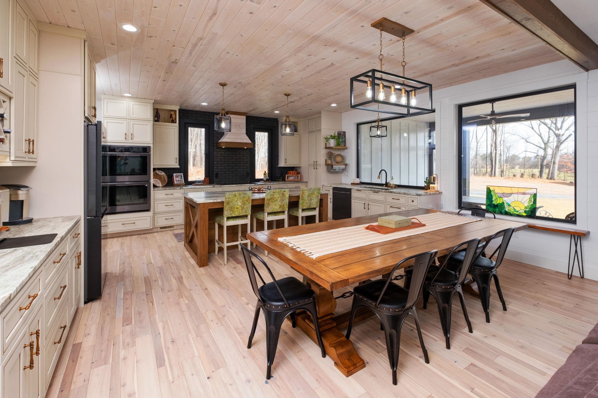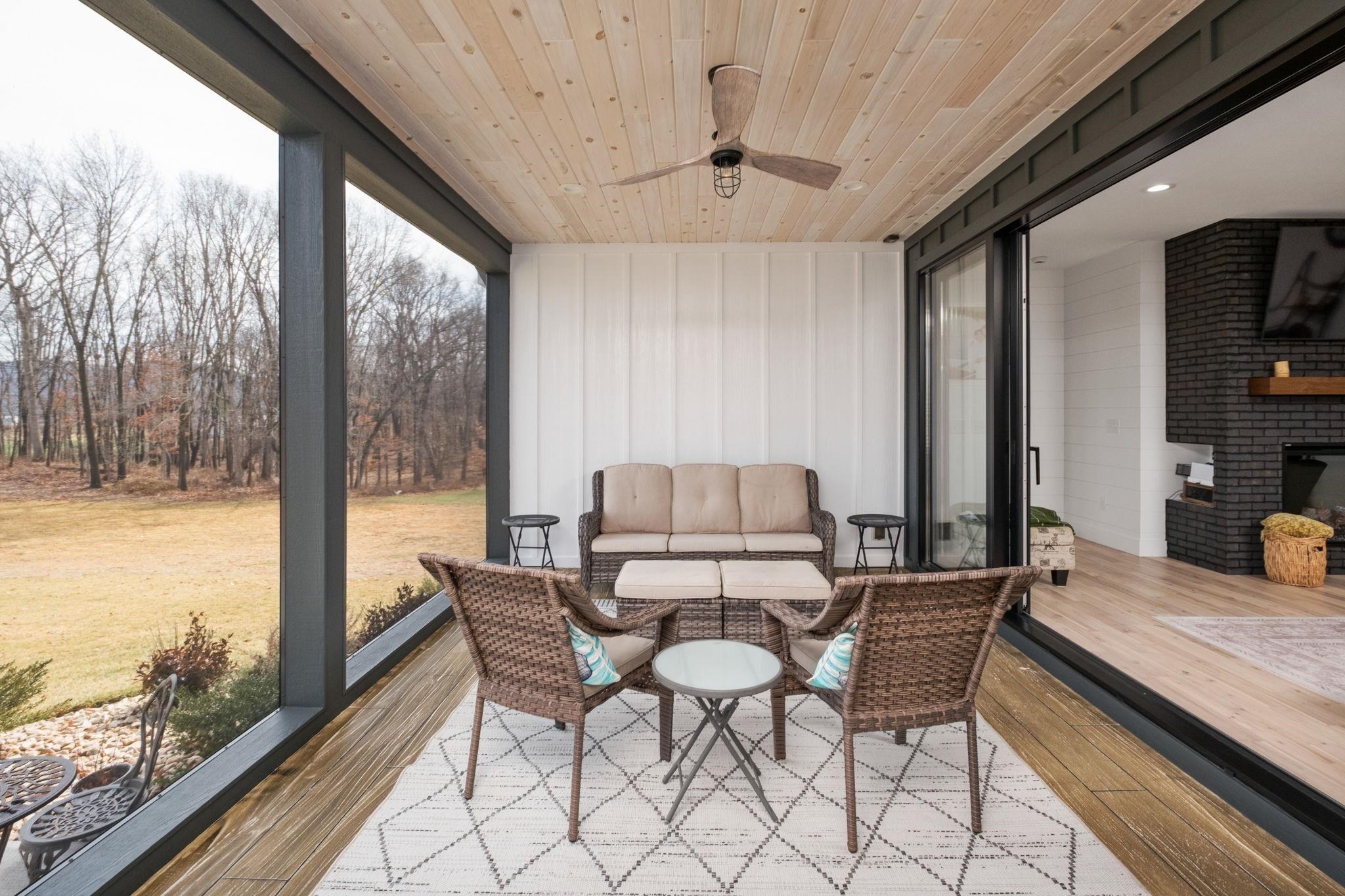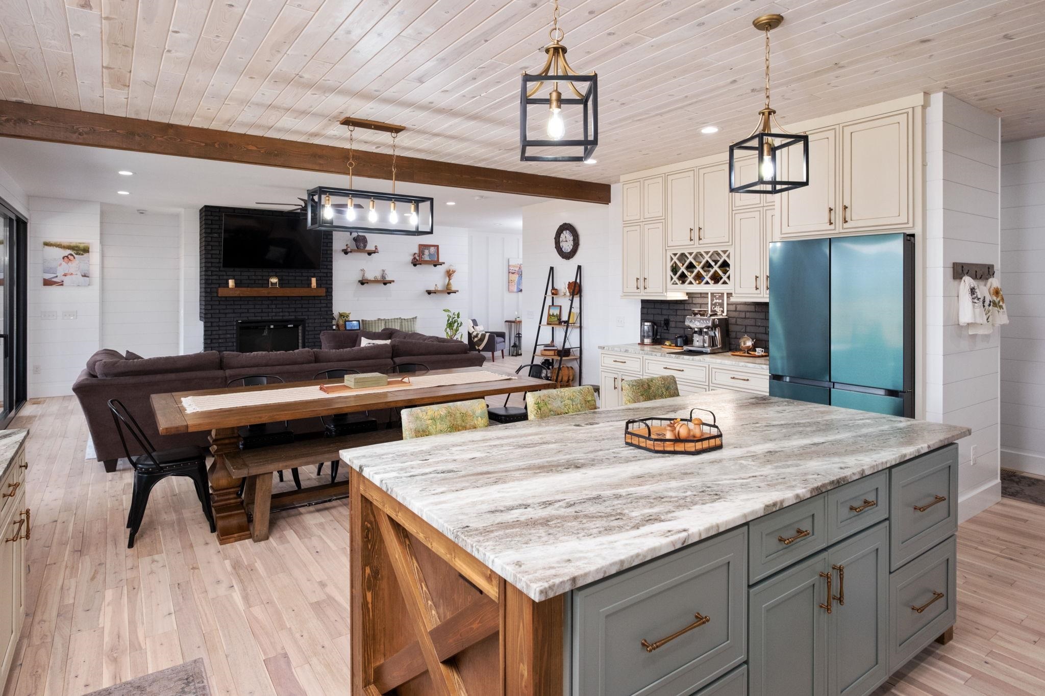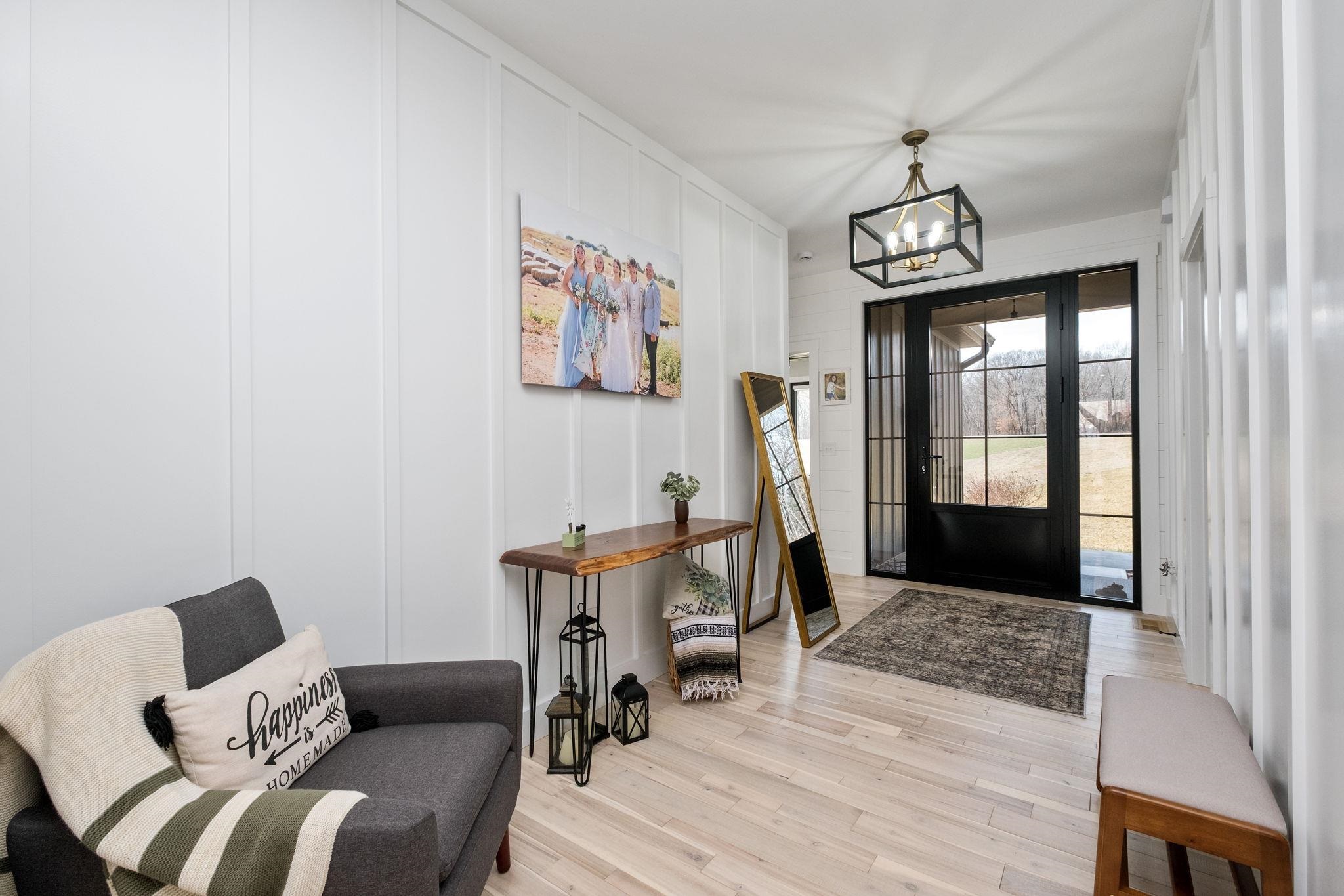 Exceptional craftsmanship and intentional design define this stunning one-level residence set on 5 private acres framed by sweeping mountain views. Offering 3 bedrooms, 2.5 baths, and a dedicated office, this thoughtfully curated home blends elegance, comfort, and functionality in a peaceful country setting just minutes from amenities. The light-filled open floor plan features hardwood floors, designer tile, and custom built-ins. A brick electric fireplace anchors the living room with warmth and character, complemented by shiplap accents. The kitchen showcases leather-finish granite countertops and a spacious walk-in pantry with shelving, countertop workspace, and cabinet-style hidden doors. Barn doors add charm to the laundry area and primary bathroom. Enjoy welcoming covered front porch overlooking the yard and paved driveway, or relax on the screened rear porch with mountain views and patio access. The 740 sq. ft. plumbed unfinished basement with exterior entry offers flexibility for storage, workshop, or future expansion. A rare opportunity to own refined, peaceful living with custom detail throughout.