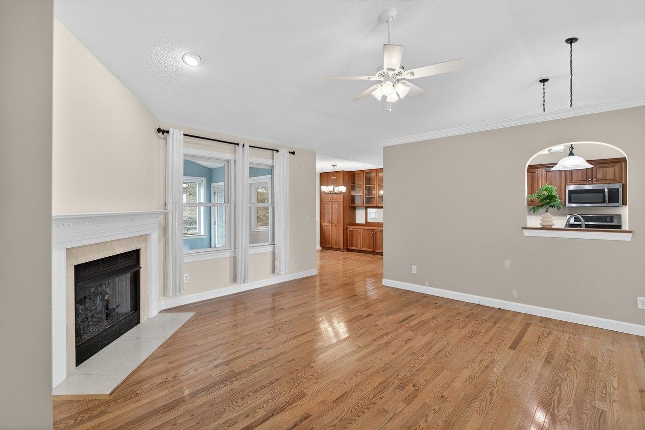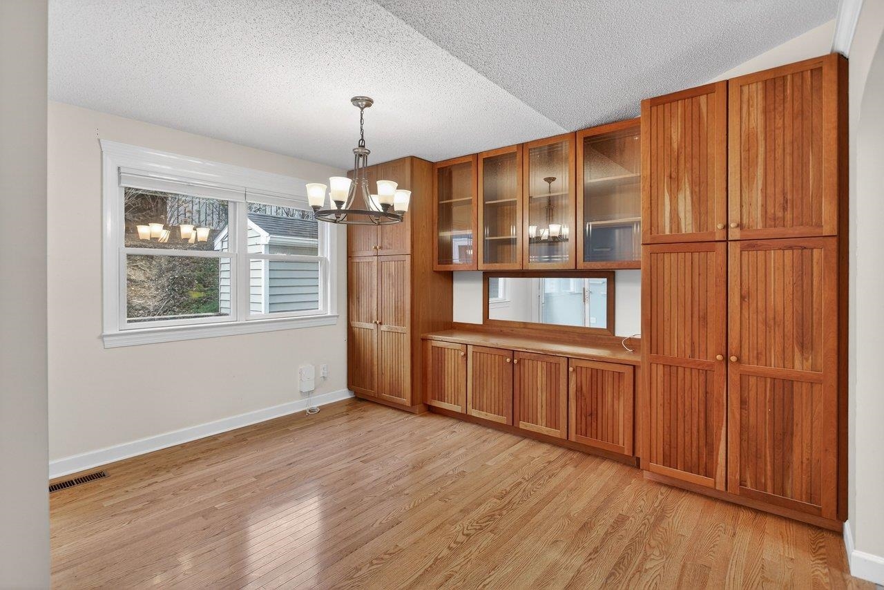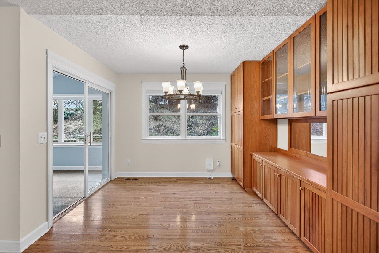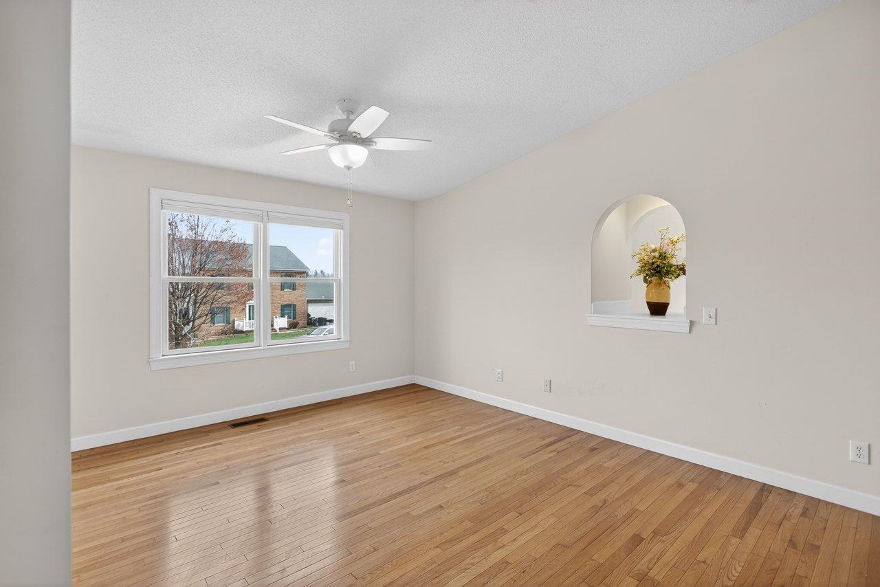 Well-maintained one-level home in a desireable city location, convenient to Sentara RMH and just minutes from JMU, shopping. The layout flows well: a proper foyer with two closets leads into a generous living room anchored by a gas fireplace and an 11-foot vaulted ceiling that carries into the kitchen. Don’t miss the dining room loaded with built-ins. The kitchen is outfitted with cherry cabinets, Corian counters, stainless appliances, and under-cabinet lighting. Hardwood floors run through all the bedrooms and living areas, with tile in the wet and transition spaces. The owner's suite is a standout: large bedroom with vaulted ceiling, dual comfort-height vanity, jetted tub with tile surround, tiled shower with glass enclosure, and a 6x10 walk-in closet. Two additional bedrooms share a full bath. Other practical highlights include a 6x9 laundry room with a large sink, an 11x11 sunroom with its own vaulted ceiling, a double garage, and a 5x13 storage shed. Outside, both the front and back feature pavered patios — the back patio is bordered by a stone retaining wall and has a retractable awning, making it a genuinely usable outdoor space. HVAC was replaced in 2021, and the crawl space is conditioned.