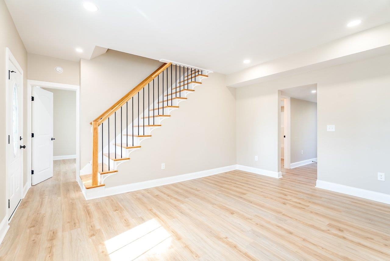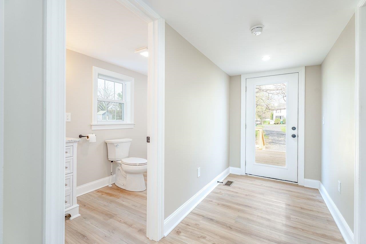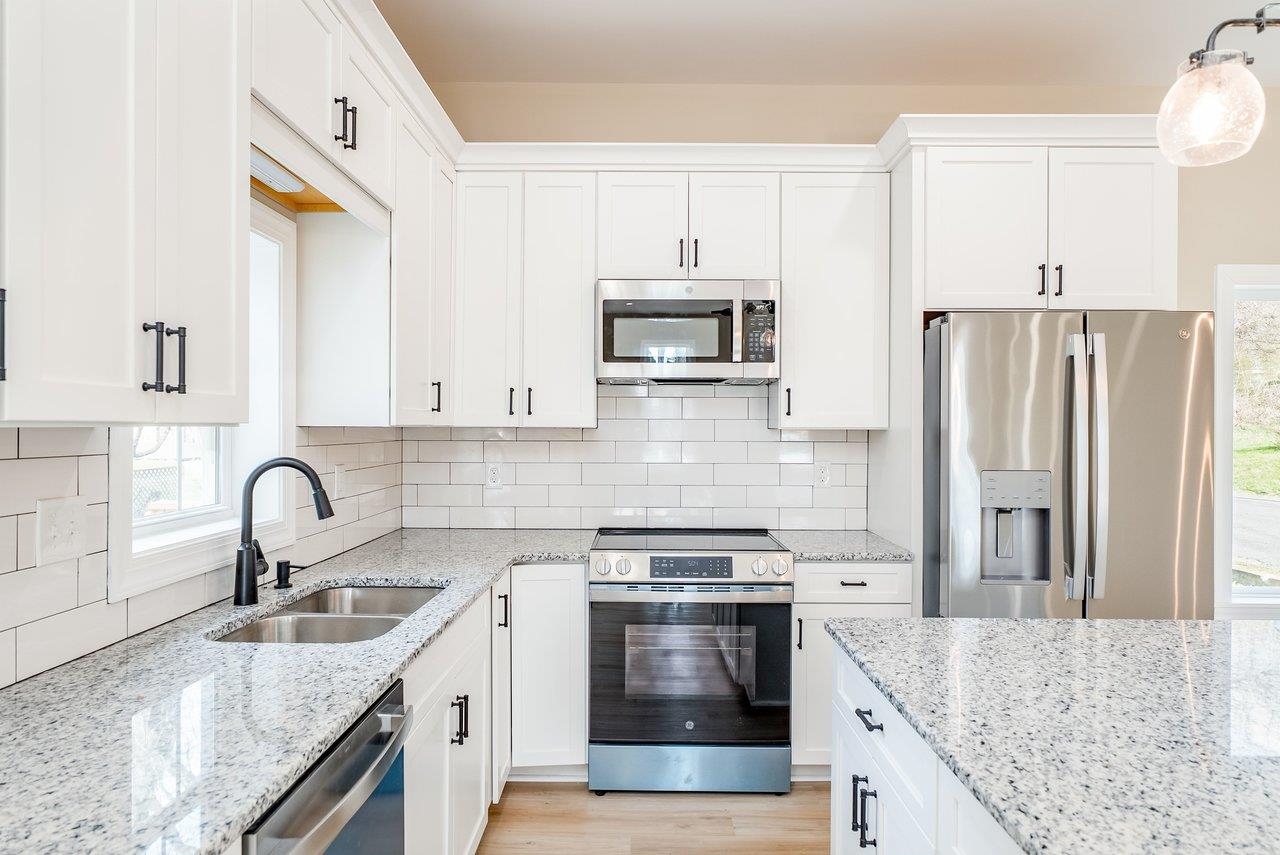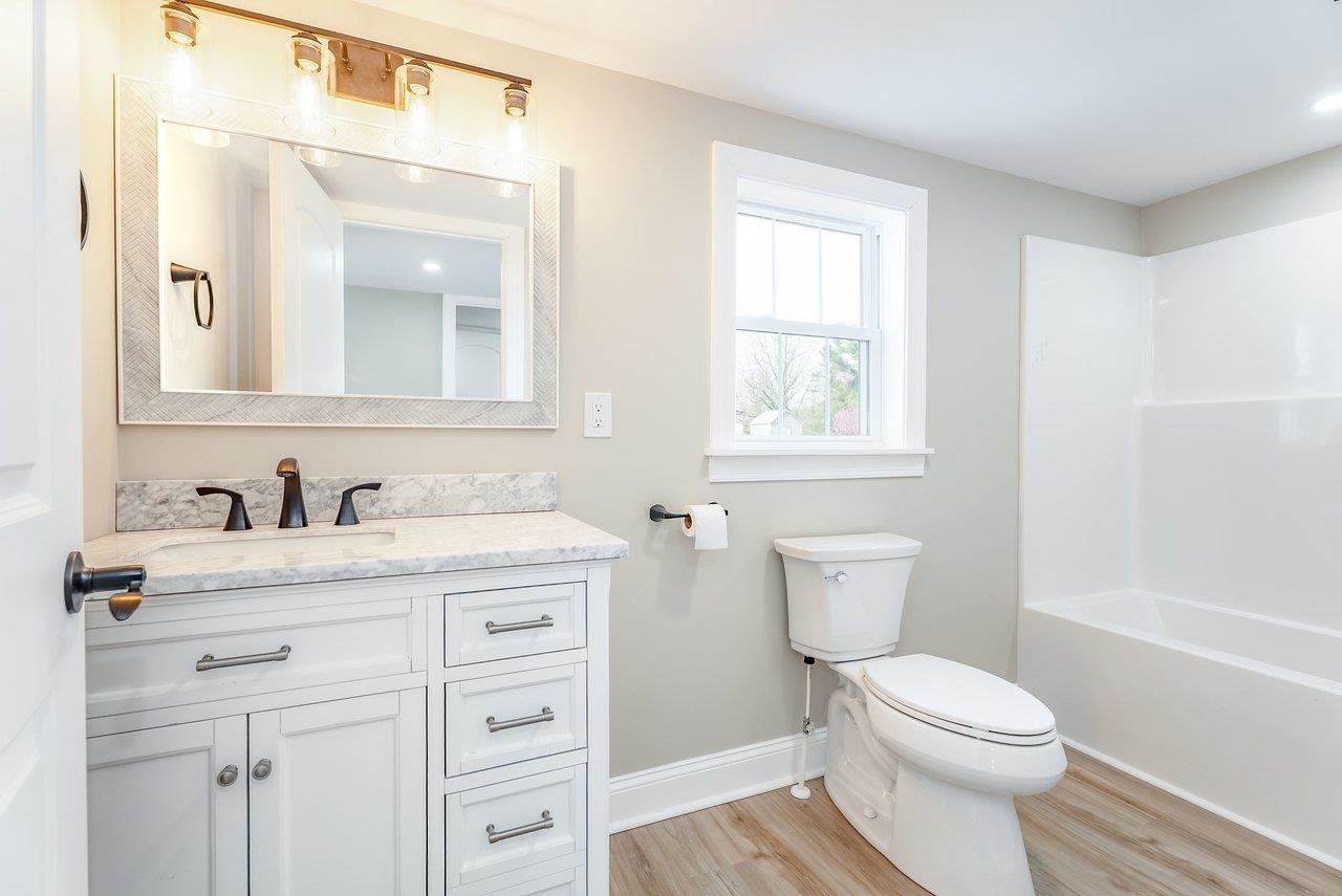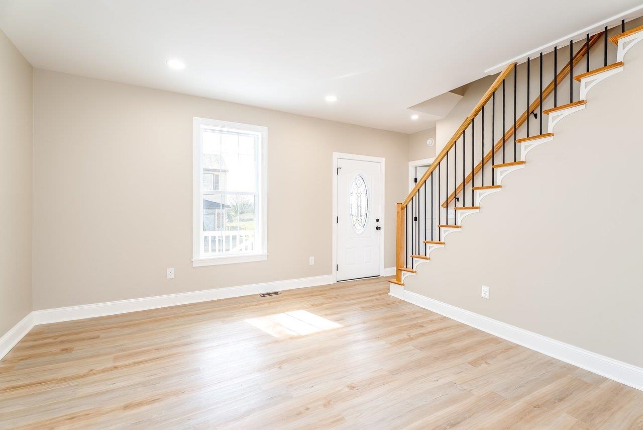 A complete renovation that honors the character of a classic 1893 home while delivering every modern finish today's buyers are looking for. The open-concept main floor impresses immediately, with tall ceilings, recessed lighting, and a showstopper kitchen featuring white cabinets, black hardware, granite countertops, stainless steel appliances, and a large island. LVP flooring runs throughout the main level, and a wrought iron stair railing with wooden stairs sets the tone from the moment you walk in. The main level also offers a bedroom, a dedicated laundry room, and a full bath with black fixtures. Upstairs, original hardwood floors bring warmth and authenticity to the owner's suite and second bedroom, each with their own private bath finished with tile, white cabinets, and black fixtures. Out back, a wooden deck overlooks a generous yard. A partially covered front porch with a white fence welcomes you home. Located just 7 minutes from Bridgewater and 15–20 minutes to Harrisonburg with easy I-81 access, this one truly has it all!