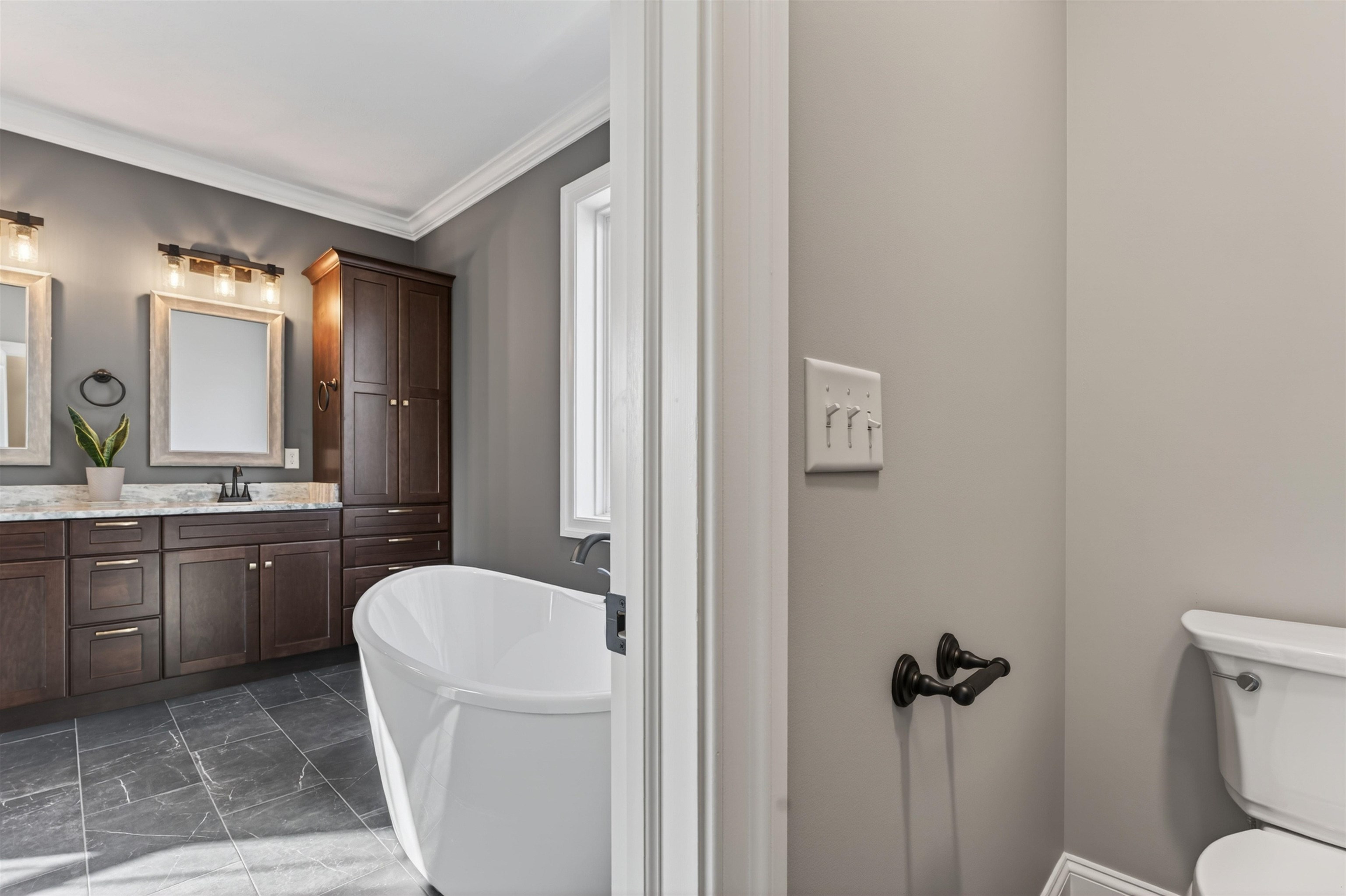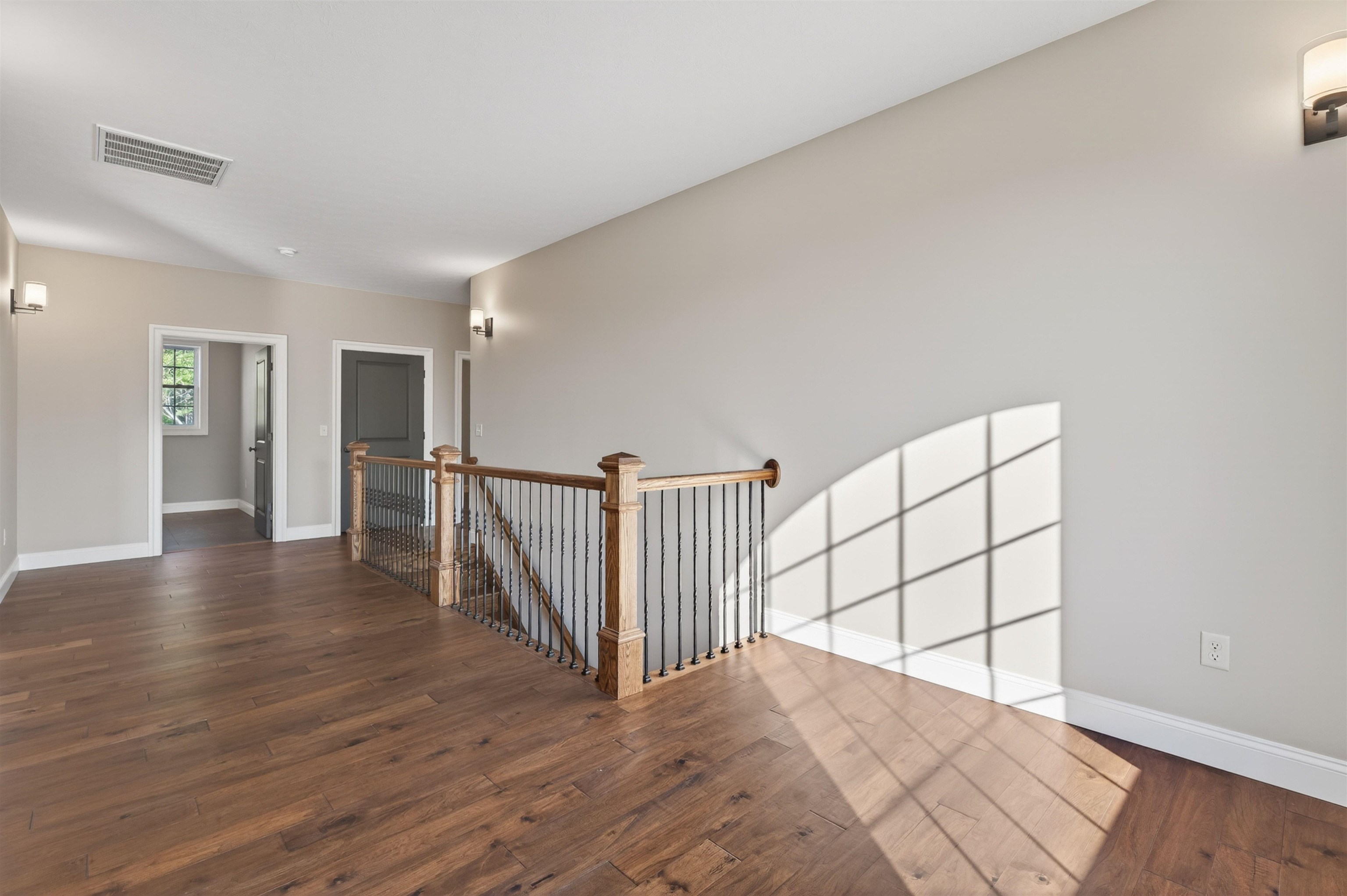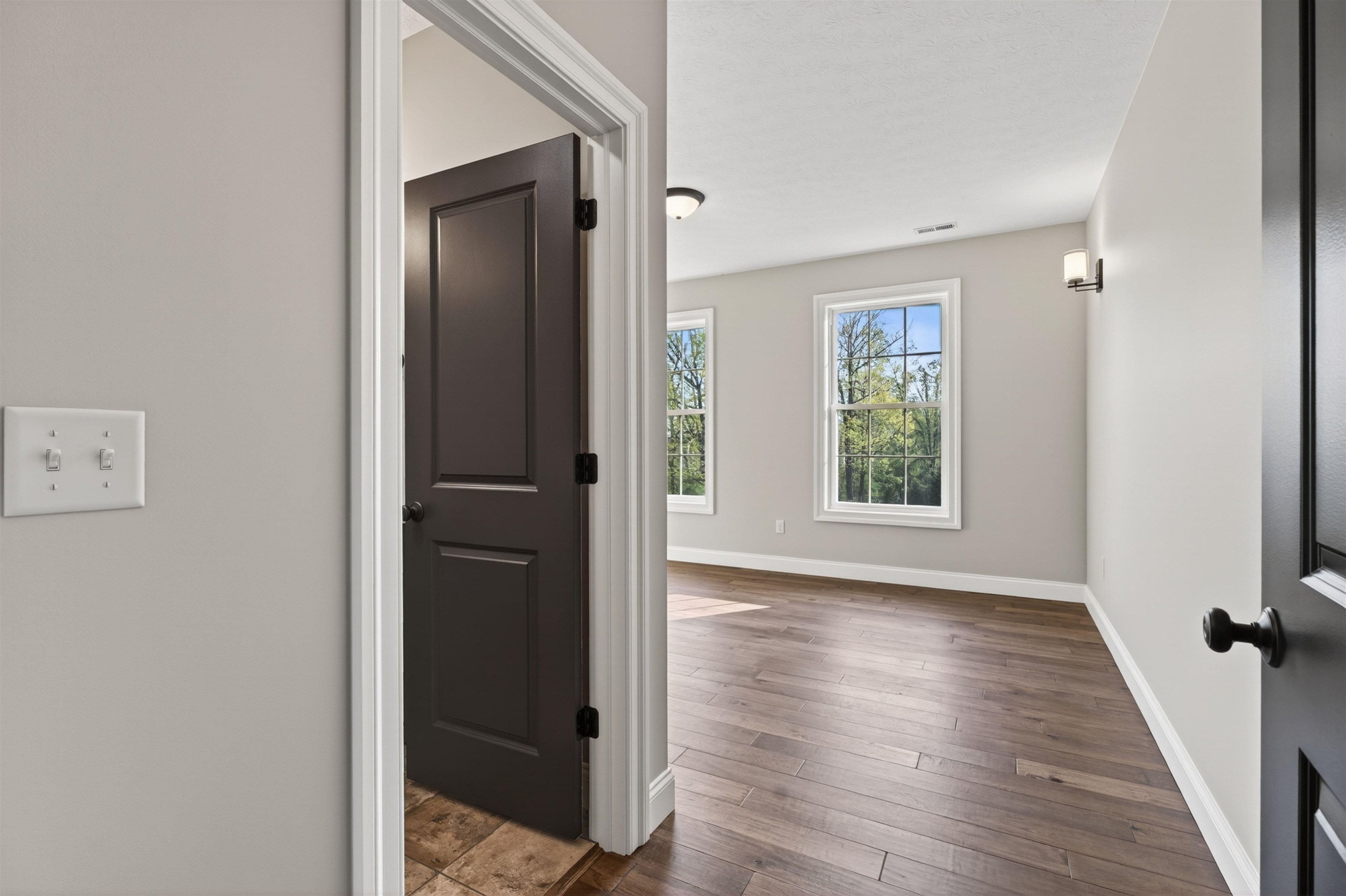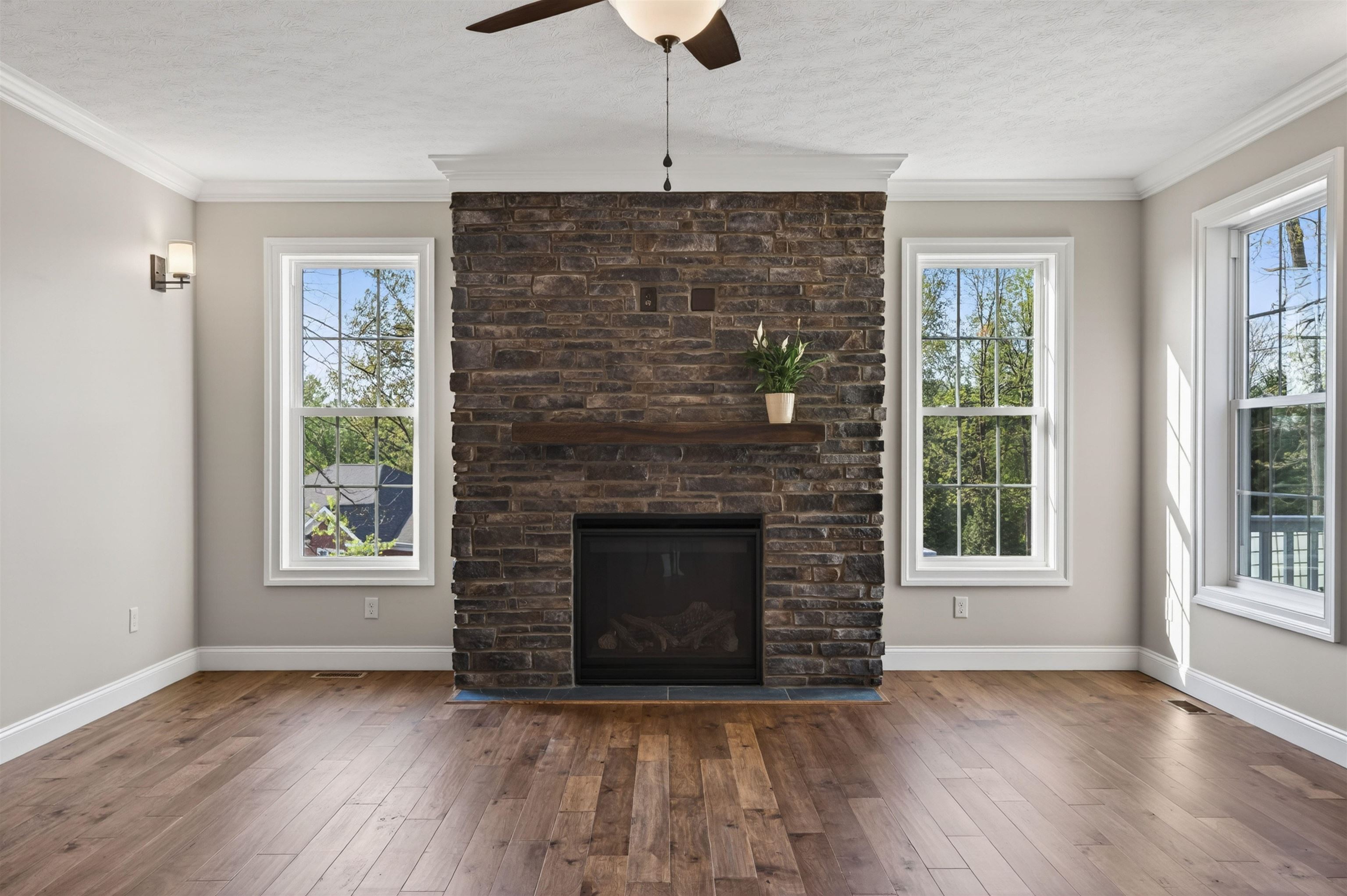 Welcome to this stunning custom home in Crossroads Farm, ideally situated on a quiet cul-de-sac. This spacious 5-bedroom, 5 full-bath residence offers exceptional versatility. The open-concept main-level features a welcoming living room with a beautiful stone fireplace, a kitchen with large island and dual pantries, a dining room, and sunroom with vaulted ceilings looking out onto a private wooded backyard. Upstairs, the primary suite has a large walk-in closet with custom shelving, a spa-like en-suite features a luxurious soaking tub, separate shower, double vanity, and private water closet. Upstairs includes two additional bedrooms with their own full baths, a bonus sitting area with gorgeous mountain views and a convenient laundry room. The finished walkout basement offers a private apartment setup with bedroom, family room, bonus room, bathroom, and kitchenette—ideal for guests or multi-generational living. Other highlights include an oversized two-car garage with 10x10 doors suitable for an RV or boat. The home has engineered hardwood floors, insulated precast foundation walls, energy star windows, 2 heat pumps and 2 water heaters for enhanced comfort and efficiency. Truly a place to call home. Some photos virtually staged.