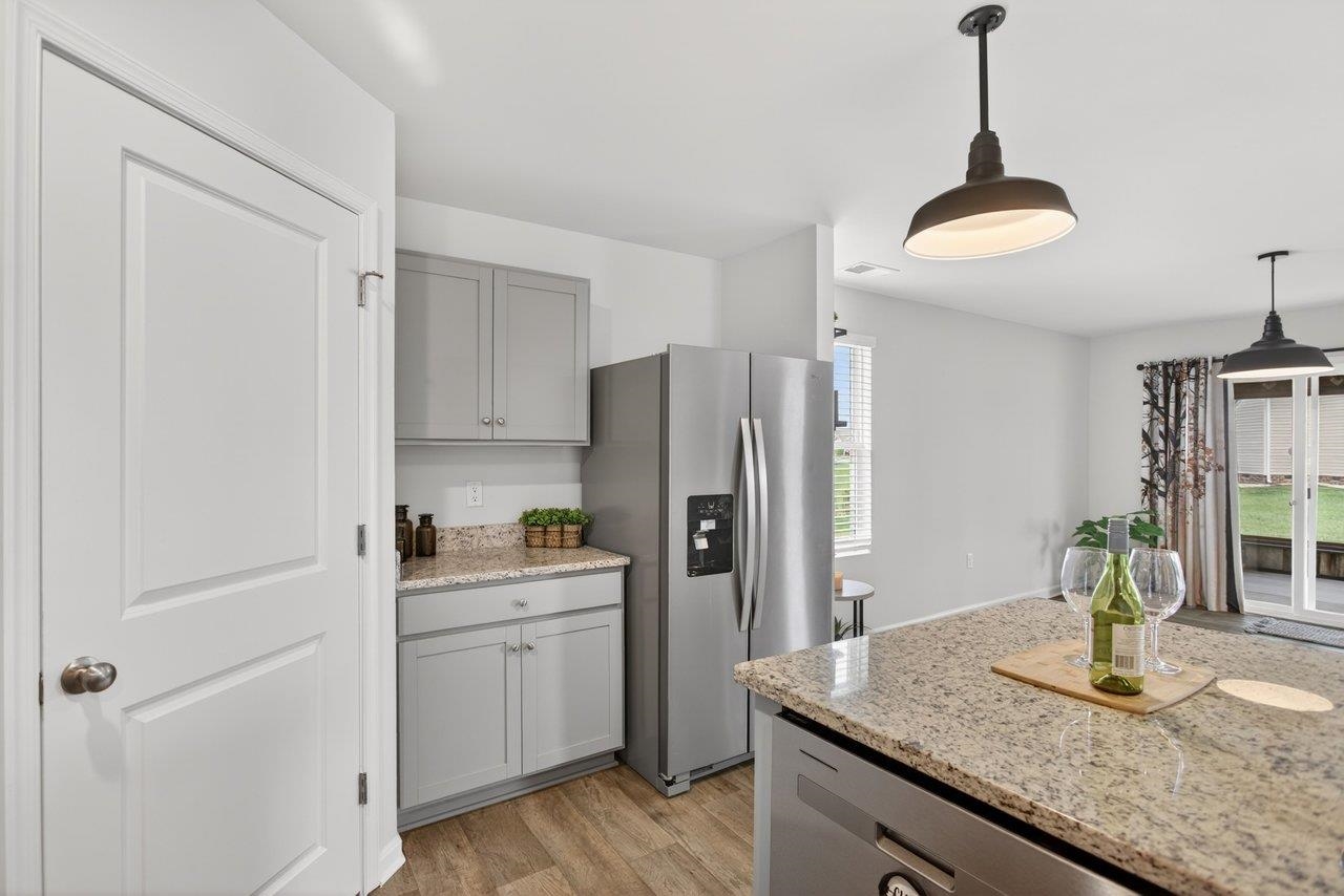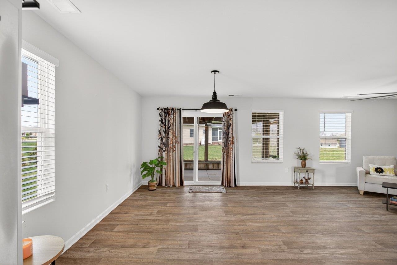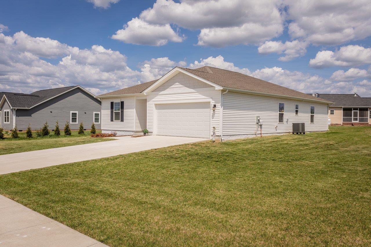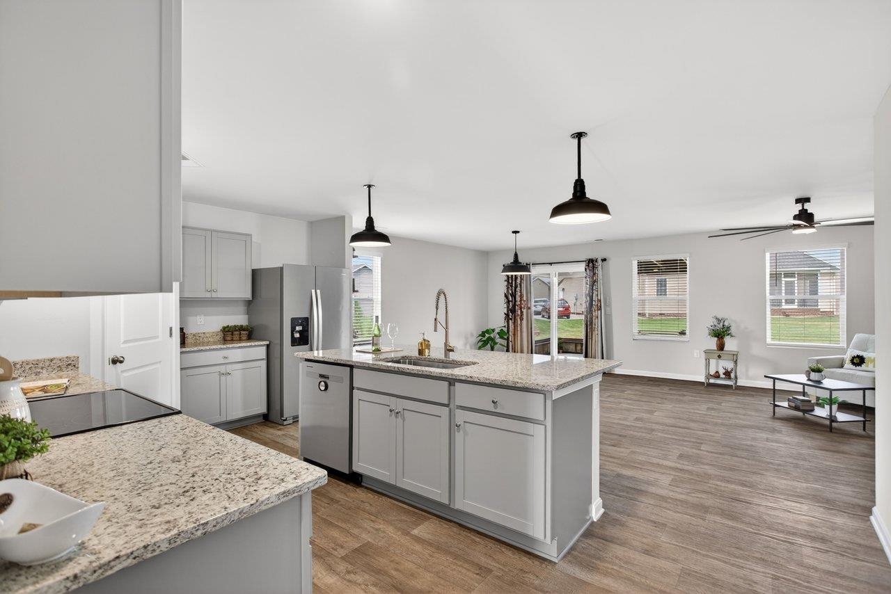 Beautiful 2023 one-level home situated on a flat lot in Coyote Run, offering a bright open-concept layout with modern finishes throughout. The kitchen is the centerpiece of the home, featuring granite countertops, a large island with seating, stainless steel appliances, ample cabinetry, and a dedicated pantry, all seamlessly flowing into the spacious living area. The main living space is filled with natural light from multiple windows and features durable luxury vinyl plank flooring, creating a warm and inviting atmosphere. The primary suite offers a comfortable retreat with generous space, a large walk-in closet, and a private bath with a large walk-in shower, while the additional bedrooms provide flexibility for guests, office space, or everyday living. Sliding glass doors lead to a covered screened porch, perfect for relaxing or entertaining, overlooking a wide, open yard with plenty of usable space. Additional highlights include an attached 2-car garage, concrete driveway, neutral color palette, and a functional layout designed for easy living.