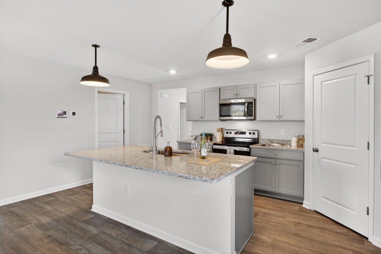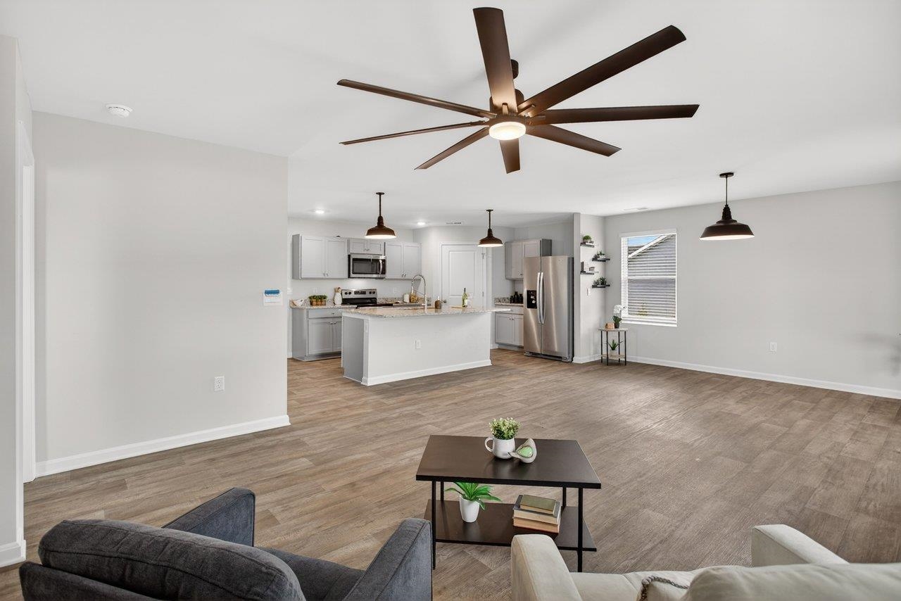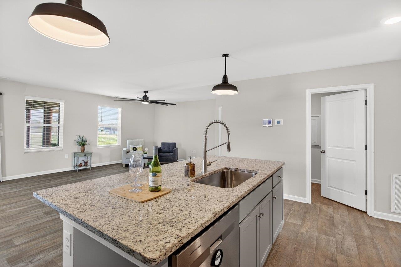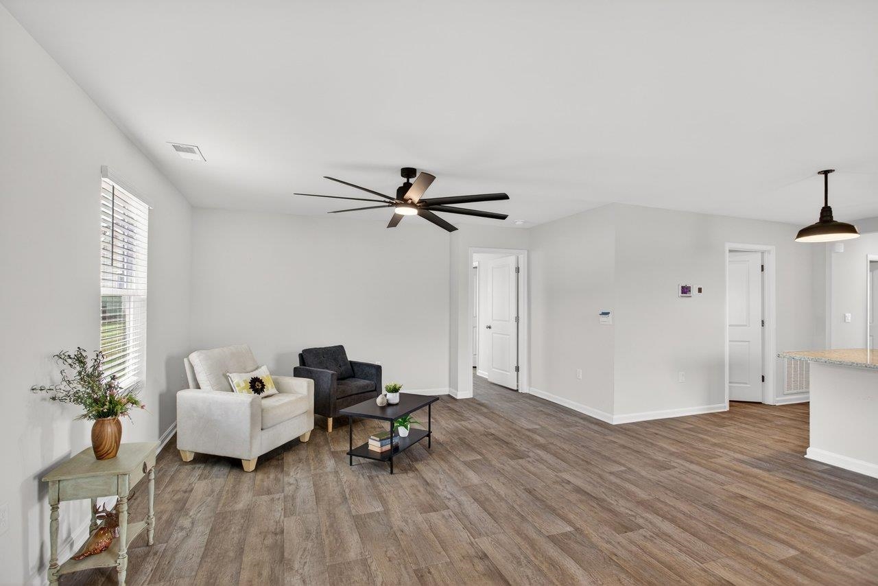 Beautiful 2023 one-level home situated on a flat lot in Coyote Run, offering a bright open-concept layout with modern finishes throughout. The kitchen is the centerpiece of the home, featuring granite countertops, a large island with seating, stainless steel appliances, ample cabinetry, and a dedicated pantry, all seamlessly flowing into the spacious living area. The main living space is filled with natural light from multiple windows and features durable luxury vinyl plank flooring, creating a warm and inviting atmosphere. The primary suite offers a comfortable retreat with generous space, a large walk-in closet, and a private bath with a large walk-in shower, while the additional bedrooms provide flexibility for guests, office space, or everyday living. Sliding glass doors lead to a covered screened porch, perfect for relaxing or entertaining, overlooking a wide, open yard with plenty of usable space. Additional highlights include an attached 2-car garage, concrete driveway, neutral color palette, and a functional layout designed for easy living.