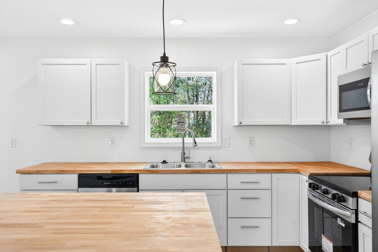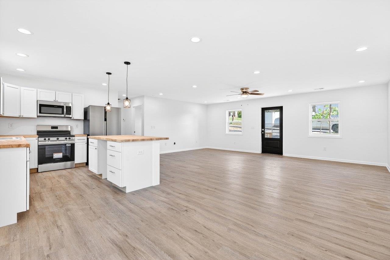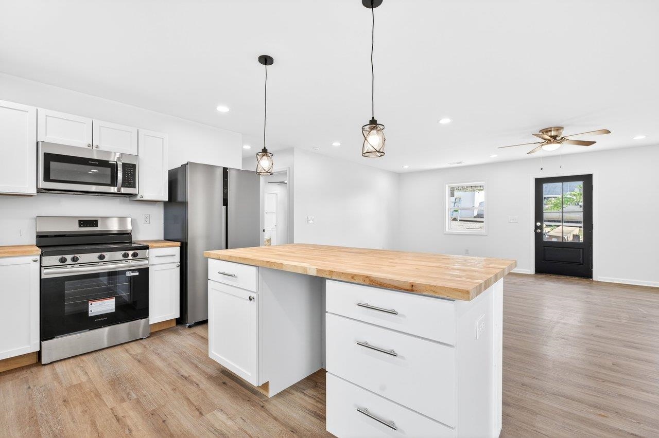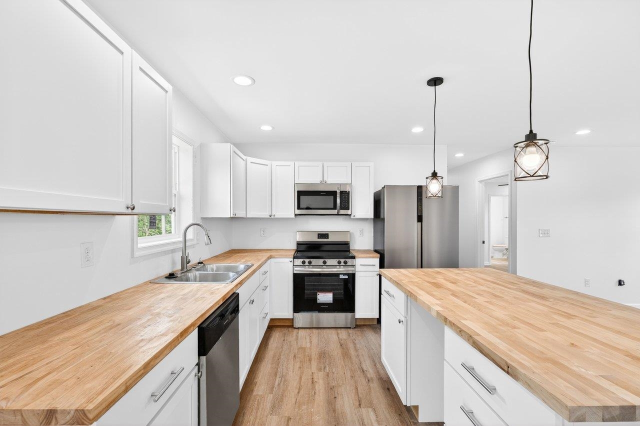 This 4-bedroom, 2-bath home offers contemporary, low-maintenance living with stylish details. The kitchen showcases butcher block countertops and white kitchen cabinets, bringing warmth and brightness to the heart of the home. Luxury vinyl plank flooring runs throughout, providing durability and a seamless look from room to room. With completion near, this home presents a fantastic opportunity to move into a crisp, modern space crafted for comfort and daily living.